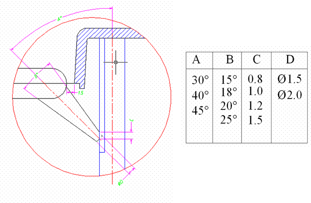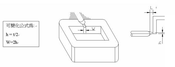 適用于大部塑料、各種側邊允許澆口痕跡的制品,開在制品的邊緣或邊緣頂面,又分標準入水、搭接入水和扇形入水,下圖中t為產(chǎn)品壁厚,L一般為(0.8—1mm)